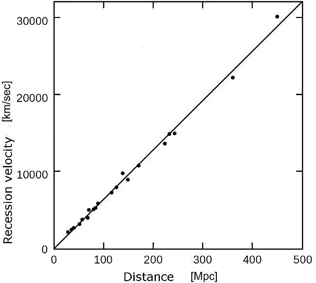 This graph shows a directly proportional relationship between recession velocity and the distance the object is from us. This is Hubble's Law and can be expressed in equation form:
